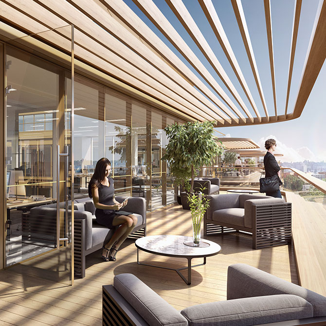 D’une surface totale de 31 000 m2 répartis sur des plateaux de 4 500 m2 à 5 500 m2, l’immeuble offrira des prestations haut de gamme (business center, espace bien-être, commerces, conciergerie et espaces de restauration innovants) et bénéficiera de 6 000 m2 de terrasses plantées et de jardins.
