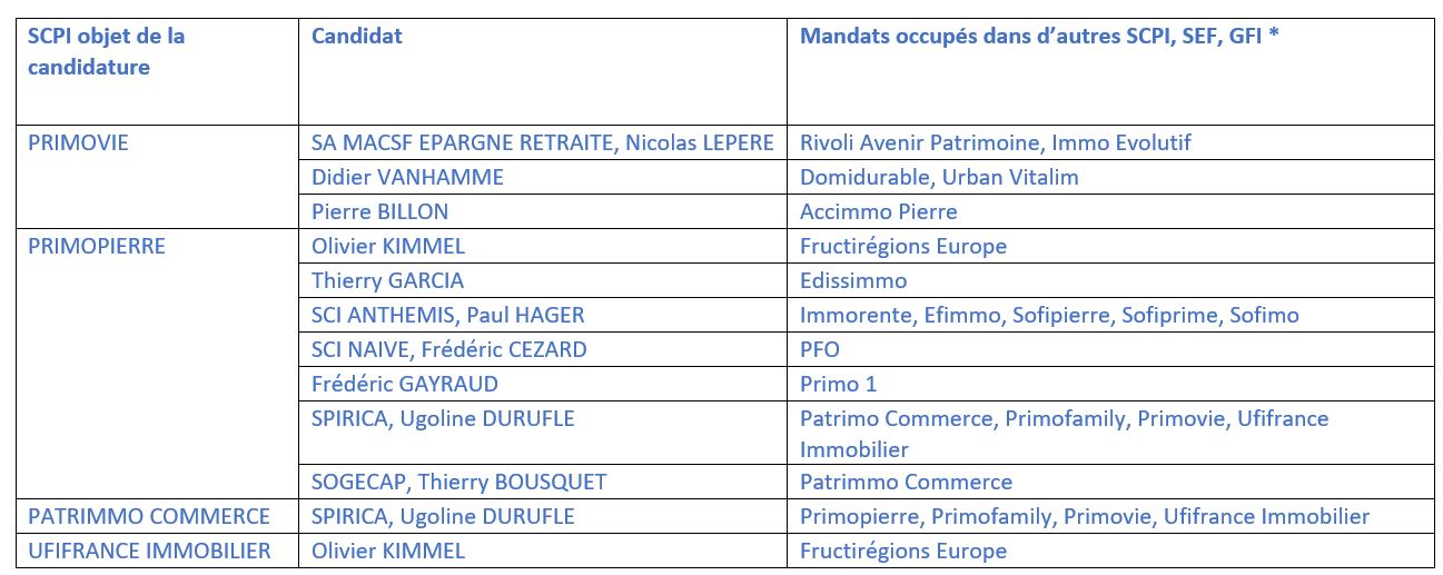 En application de la doctrine de l’Autorité des Marchés Financiers, Primonial REIM met à la disposition des associés des SCPI qu’elle gère la liste exhaustive des mandats de membre de conseil de surveillance occupés dans d’autres SCPI, SEF ou GFI (gérés ou non par Primonial REIM) par les candidats aux élections des conseils de surveillance soumises aux votes des prochaines assemblées générales.